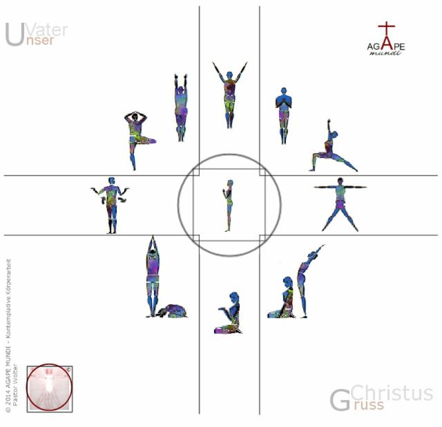 - Aufrecht stehend und mit geschlossenen Beinen richten wir die Arme weit ausgestreckt (wie ein Kelch) zum Himmel, atmen tief ein und sprechen während wir ausatmen die erste Zeile des Vaterunser.